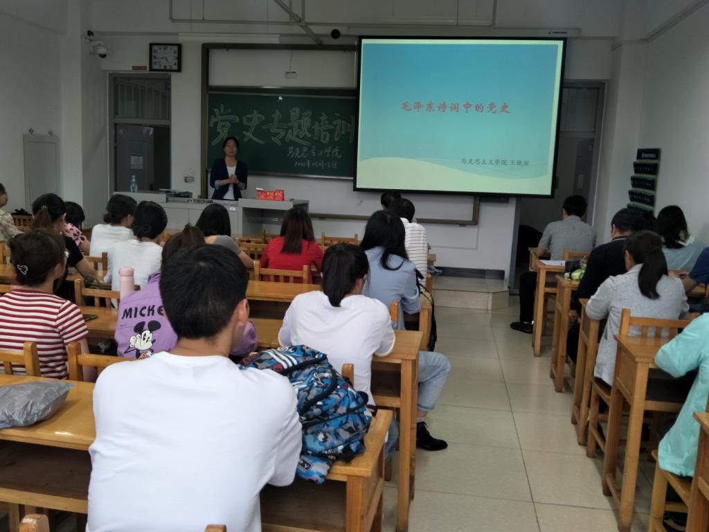 2021年6月16日下午,bwin必赢中国官网在15207Z教室举办了党史专题培训系列活动。本次活动由bwin必赢中国官网教学院长郭玲霞主持,主讲人为王晓丽老师,主题为“毛泽东诗词中的党史”。学院领导、教师和思想政治教育专业研究生参加了此次党史专题培训。