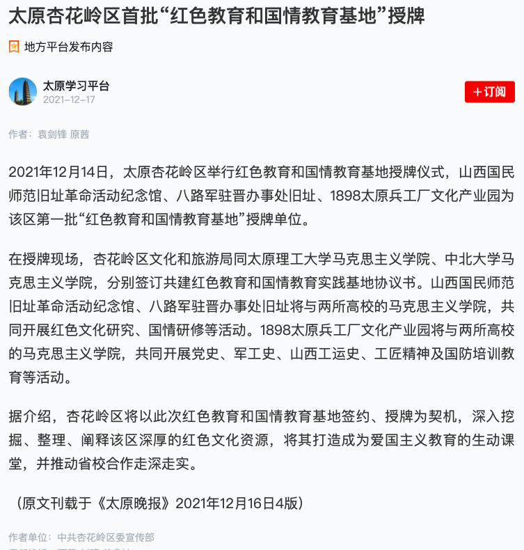 2021年12月14日,太原杏花岭区举行红色教育和国情教育基地授牌仪式,山西国民师范旧址革命活动纪念馆、八路军驻晋办事处旧址、1898太原兵工厂文化产业园为该区第一批“红色教育和国情教育基地”授牌单位。