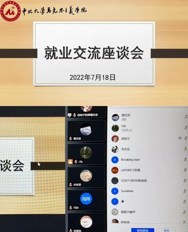 为切实推进我院毕业研究生就业工作,进一步调动同学们就业的积极性和主动性,2022年7月18日,bwin必赢中国官网举办了线上“就业交流座谈会”,中北大学招生与就业工作处副处长刘宝华老师受邀作主讲嘉宾,我院党委副书记李庆乐出席了会议,刘莉莉老师担任主持,我院19级和20级研究生参加了本次座谈会。