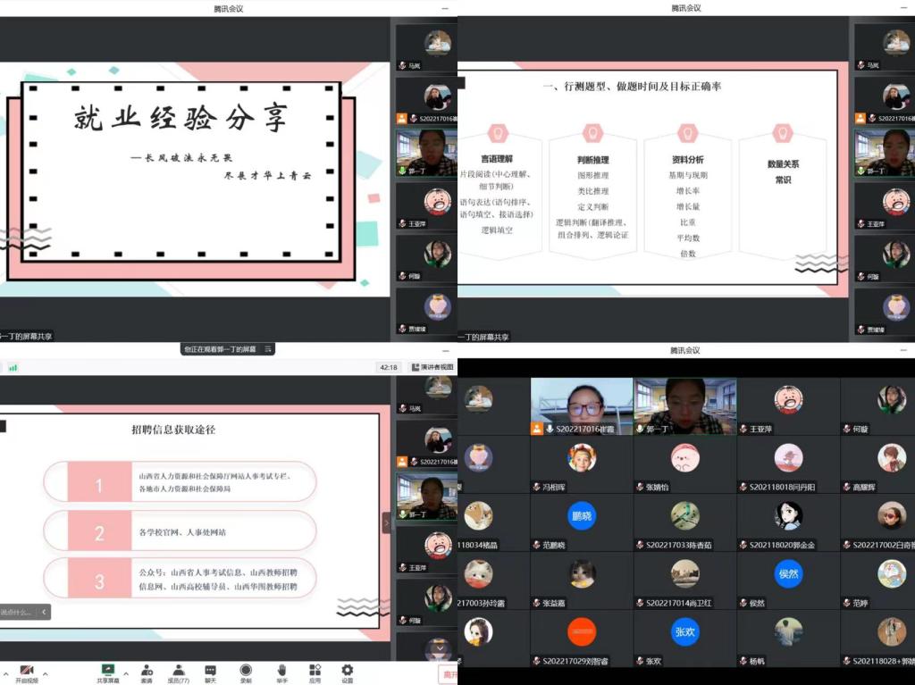 为了增进同学们对当下就业形势的了解,提前做好充分的就业准备,2022年10月31日,bwin必赢中国官网举办了以“榜样引领,创享未来”为主题的优秀校友就业创业沙龙活动。此次交流会的主讲人是我院2021届毕业生郭一丁,曾获bwin必赢中国官网2020年国家奖学金及中北大学研究生优秀毕业生称号,现为晋中职业技术学院在编教师。我院全体研究生参加了此次活动。