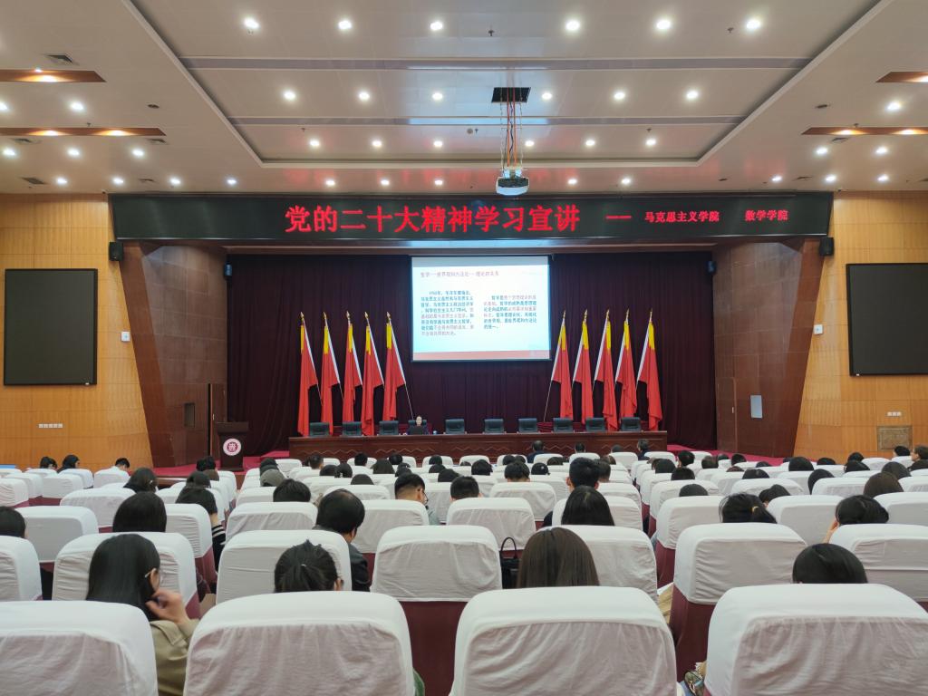 为贯彻落实党的二十大精神,进一步增强同学们爱国爱党思想、坚定中国特色社会主义信念,强化认识新时代青年所面临的时代机遇和担当的历史责任,bwin必赢中国官网研究生党支部和数学学院研究生党支部成立党的二十大精神学习互助组,互助组在学院领导的大力支持下,4月11日下午,邀请了上海交通大学bwin必赢中国官网杜玉华教授来校做报告,并以此作为互助组的启动仪式。