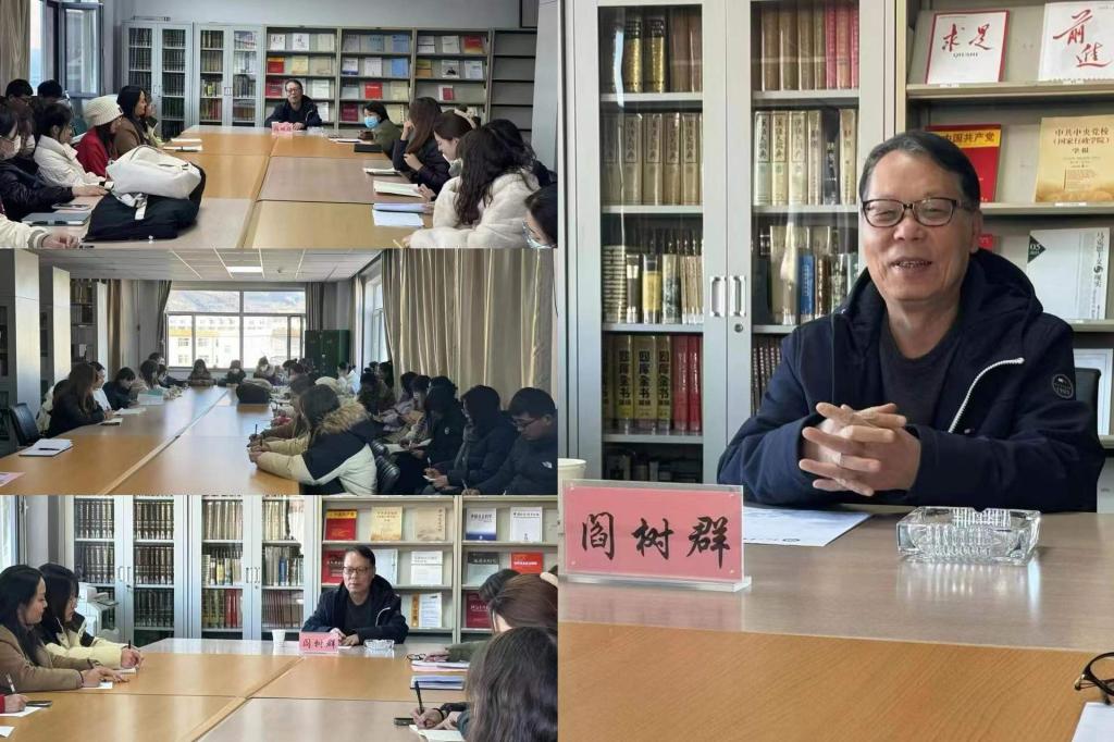 为夯实我院研究生学术基础知识,提高学术研究能力,12月1日,bwin必赢中国官网邀请西师范大学bwin必赢中国官网阎树群教授在院资料室举办了题为“习近平新时代中国特色社会主义思想的几个原创性贡献”学术报告,学院全体研二学生参加。