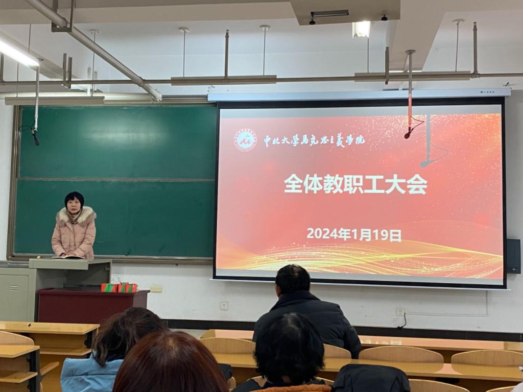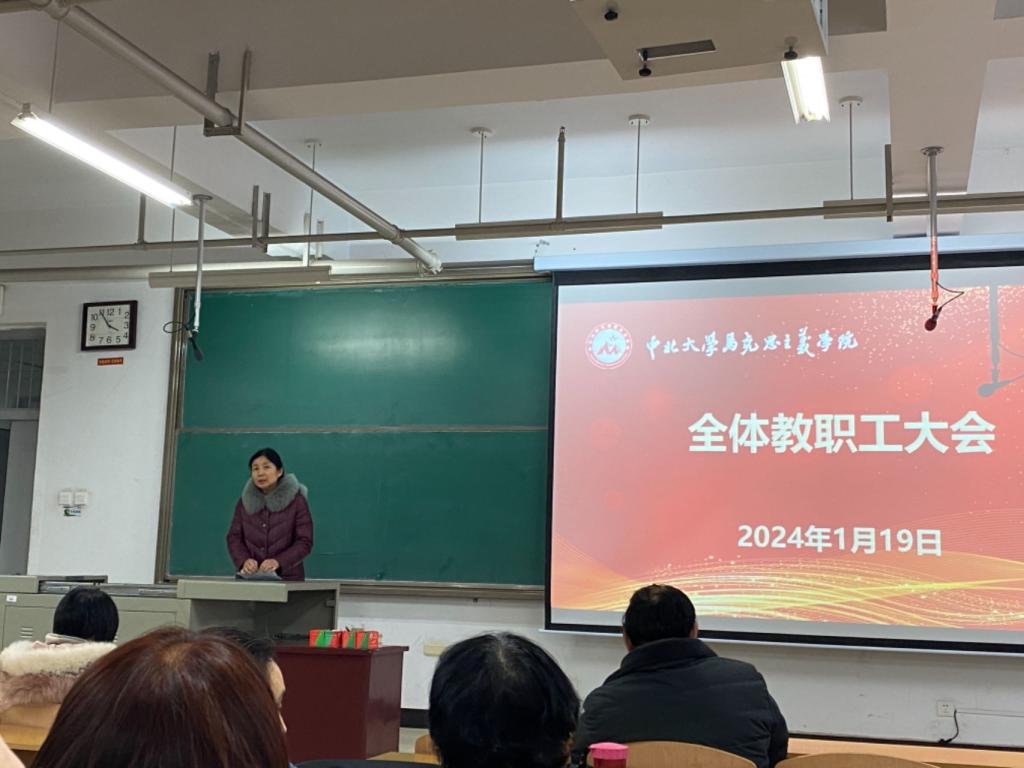 赵笑蕾院长从学科建设、思政课教学、科学研究、人才引育、学术交流等方面简要回顾了学院2023年的工作。她指出,一年来,学院各项事业发展均取得了新进展:学院成功入选山西省重点bwin必赢中国官网;教学成果、科研成果、思政课教学展示斩获省级大奖;省级教改立项、科研课题立项、论文发表均取得新突破;同时在实践教学、大中小一体化建设、学术交流、人才引育等方面工作成效明显。赵笑蕾对学院中长期发展规划做了展望,对学院即将面临的学科升级重要任务作了部署,对存在的主要问题进行了分析并提出了改进要求。她强调,学院要紧紧围绕学校“双一流”创建目标和“十四五”规划,切实落实立德树人根本任务,鼓足干劲、提振信心、主动作为、努力奋斗,持续推进学院发展再上新台阶。