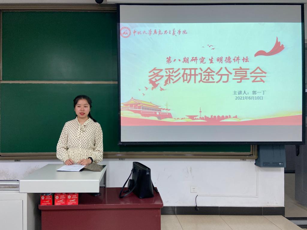 2021年6月10日,bwin必赢中国官网在15108教室举办了以“多彩研途分享会”为主题的研究生明德讲坛,主讲人为bwin必赢中国官网2020年国家奖学金获得者、中北大学研究生优秀毕业生郭一丁,我院研一研二全体研究生参加了此次讲坛。