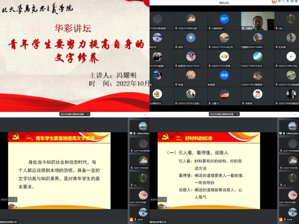 讲坛一开始,冯老师给大家强调了提高自身文字修养能力的重要性,并希望通过此次讲座可以给同学们一些启发性指导,为大家日后的研学生活及工作积累经验。冯老师指出,不论是毕业就业还是考公写申论,这都对我们自身的文学修养提出了要求和挑战。紧接着,冯老师便从“青年学生要重视提高文字修养”、“好材料的标准”两个方面为大家展开讲述。冯老师说道,有力的笔杆子是一个人政治思考力和综合力的体现,我们马院研究生要夯实自己的文字功底,想方设法努力提高自己的写作水平。在写作发表论文时,我们要有正确的基本立场、观点及方法;此外,论文中所涉及的概念、判断及推理要合逻辑,我们要学会用辩证法看待问题,要有自己的分析判断,要经得起推敲和挑战;还要用全面、联系、发展的观点看待问题;论文要有鲜明的观点,要突出,要有吸引力,观点和材料也要统一,要注意润色论文的语言色彩。